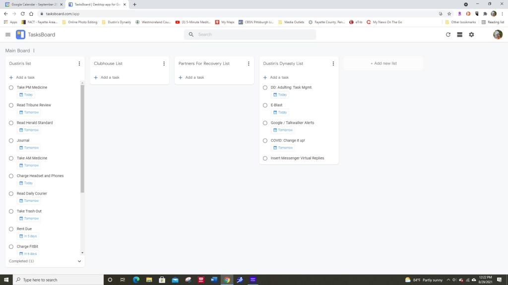 A branch of Google Calendar, Google Calerndar acts as your connected “to-do” list and cam help you completer everyday tasks, those that you need to do only a few days a week, month or once a year. It helps by sending a reminder to your phone as a push notofication with the ability to mark down if the tasks have been completed, On the list you have the ability of the task occuring on a certain day or days of the week and further by a certain time of the day, a very helpful tool indeed. Taskboard meanwhile can help you by synchronizing all your list and putting them side by side so you can see “the big pictire.” In both tools tools, you can move items from list to list if necessary.