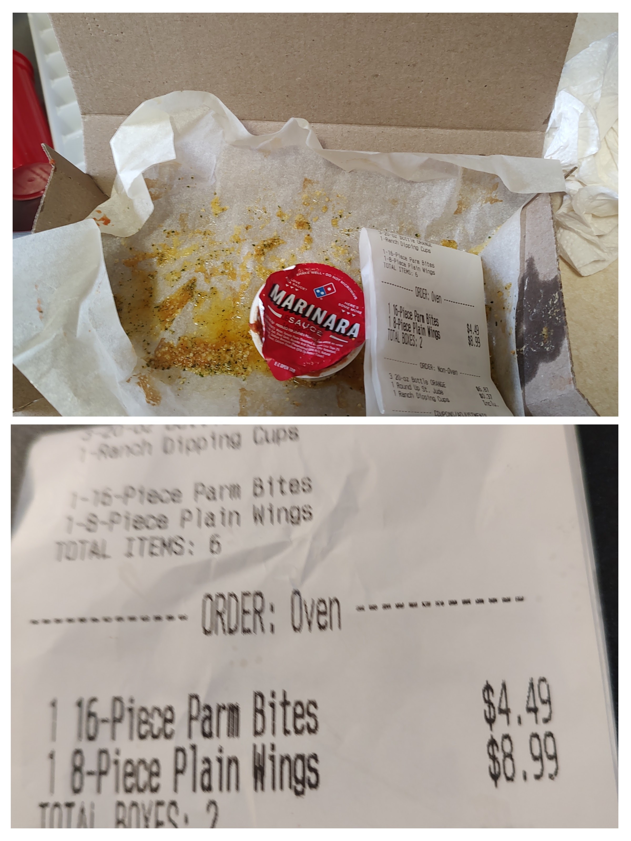 Upon my order’s arrival, I checked the boxes to discover in the place of the 16-piece parmesan bread bites that there were 16 plain wings in the box in addition to the 8 wings I had ordered.